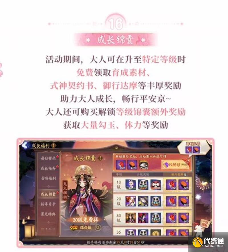 活動期間,大人可在升至特定等級時免費領取育成素材、式神契約書、御行達摩等豐厚獎勵,助力大人成長,暢行平安京~大人還可購買解鎖等級錦囊額外獎勵,獲取大量勾玉、體力等獎勵。