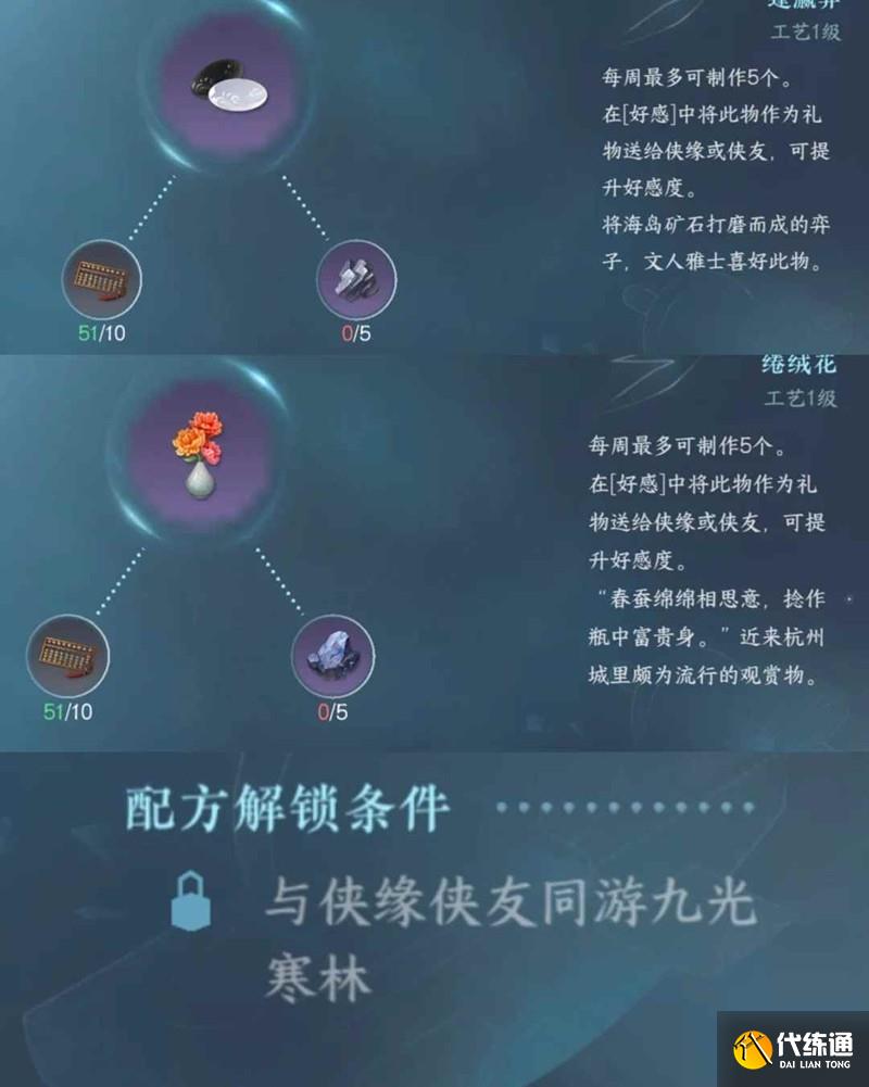 如果好感禮物比較緊缺,活力銅幣有余的話可以做身份工藝里的【蓬瀛弈】和【綣絨花】,每周可以做五個,每個增加24好感度?!揪J絨花】的解鎖條件是和任意俠緣俠友同游九光寒林(知心著意三解鎖)。