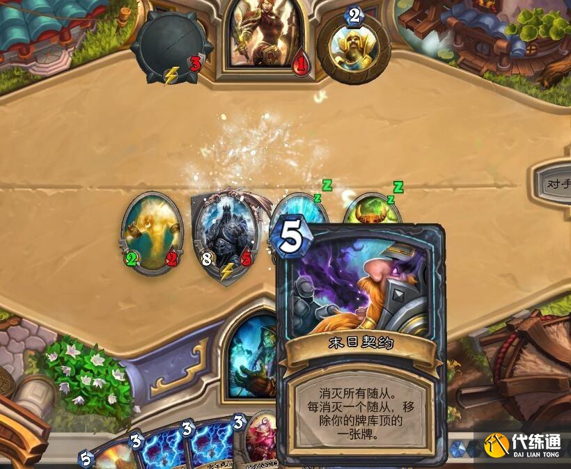 在個人看來這更像是一張傾向自毀式的玩法。5費消滅場上的所有隨從,等于將自己的場面也清理干凈。但是每當(dāng)消滅一個隨從,必須移除你牌庫頂?shù)囊粡埮啤km然如此一來代價未免過大,但是,假如你沒有太多的好方法去處理對方的隨從時,也許這就是最后一個方法了。