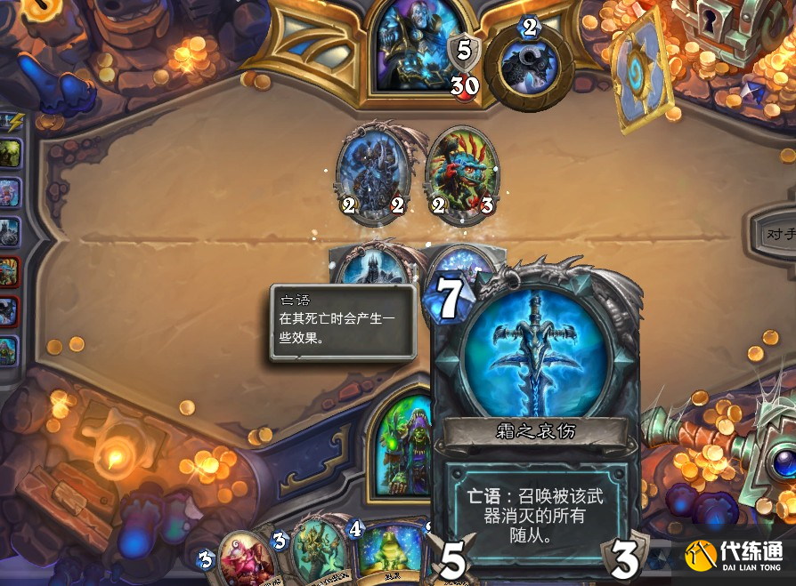 霜之哀傷7費5/3,爐石中的超強(qiáng)武器之一,武器隕落之后還能召喚出所有被這把刀消滅的隨從,性價比非常高。唯一的缺點,也許就是這把刀的費用略高了。首先你得先裝備上這把武器,其次你得賣臉去消滅一個隨從。不知道有多少玩家跟筆者一樣,當(dāng)你想享受一次霜之哀傷的效果時,卻不慎賣臉被對方一波AOE解決掉了,但整體來說還是強(qiáng)。