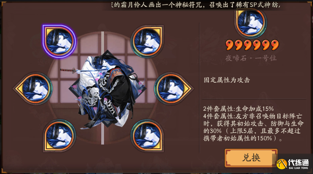 4件套屬性:友方非召喚物目標陣亡時,獲得其初始攻擊、防御與生命的30%(上限5層,且最多不超過攜帶者初始屬性的150%)。