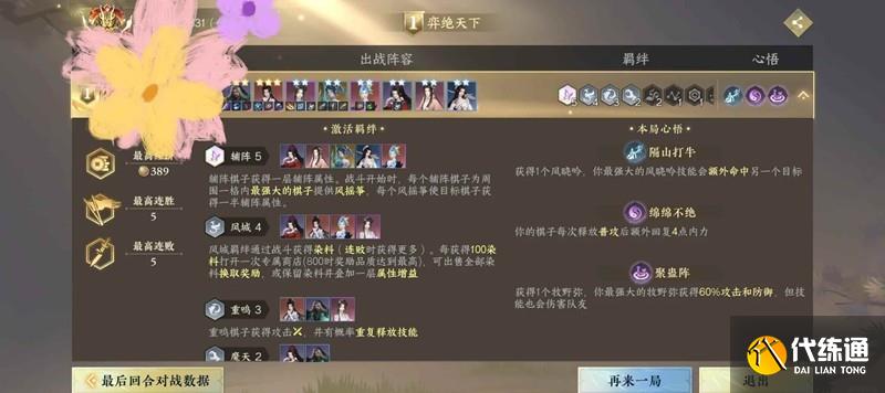 第二三個心悟我們選回藍/重鳴/經(jīng)濟/輔助相關(guān)的心悟,或者如果有996可以選996,進第二輪野怪的時候正常進度是400/500,這個時候我們停止連敗轉(zhuǎn)敗為勝,只留下鳳千錦,鳳曉吟,鳳云羅,直接上輔助(二星),看情況連勝到600或以上收菜,此時賣掉鳳千錦換重鳴湊成3重鳴。