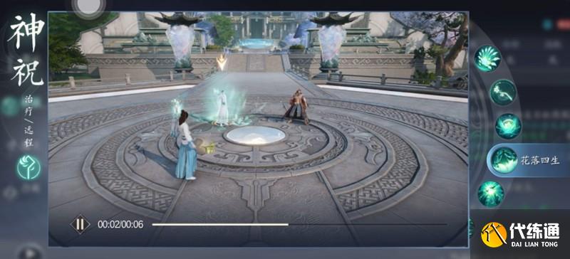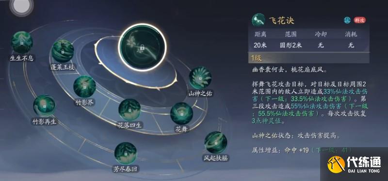 花落四生是神祝的主要單體治療技能,基于自身仙法攻擊力為隊友恢復生命值。該技能會自動選擇血量最低的隊友進行治療,大大降低了操作難度。在山神狀態下進化為芳盡春回,不僅治療量大幅提升,還會附加持續恢復效果,成為拯救瀕危隊友的關鍵技能。