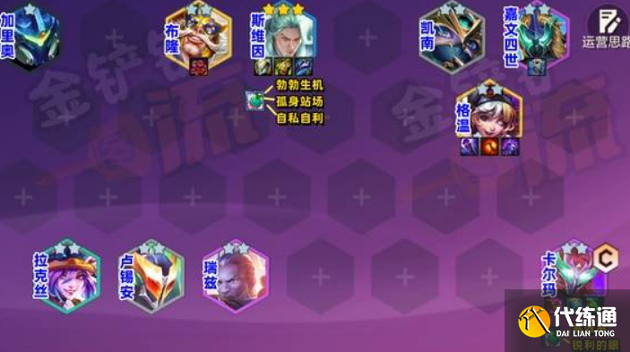可用法師+護衛組合,或3超級+2法師過渡。利用1費盧錫安或2費拉克絲搭配卡爾瑪裝備打工,保持連勝,容錯率高,贏多輸少即可穩定發展。