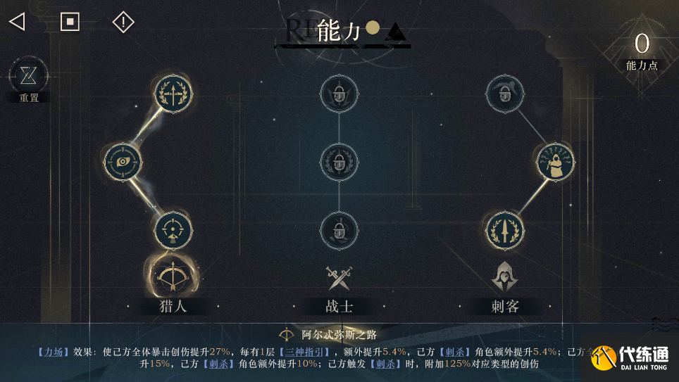 激活全部獵人分支后,卡珊德拉可使己方暴擊暴傷提升、己方觸發刺殺時倍率提升和增加致命傷層數,暴擊暴傷可以被告別大地轉化為創傷加成,收益相當可觀,剩下2個能力點有3種分配方式: