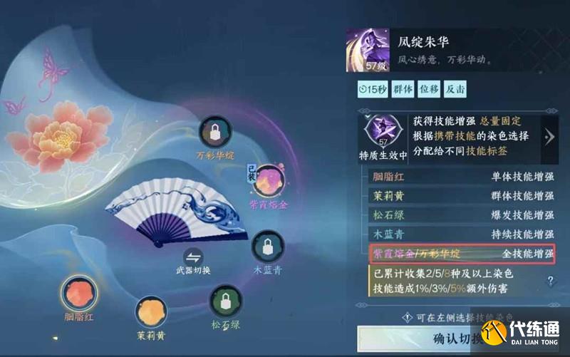 技能染色使用優(yōu)先紫霞熔金(全技能加強3%),其他顏色獲得即可不用切換