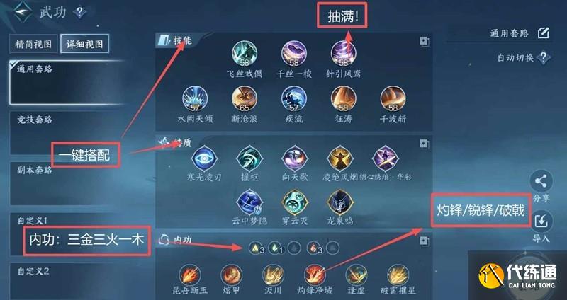 內功開三金三火一木周天,汲川/破霄/昆吾/逢虛/熔甲五個內功必上,最后一個內功從灼鋒/破戟/銳鋒中選詞條最好的即可!