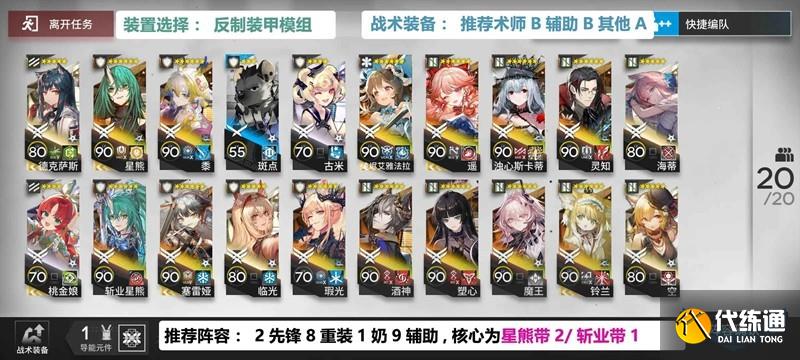 核心:采用星熊2或者斬業星熊1(都不用專精),裝置推薦選[反制裝甲模組],陣容為2先鋒8重裝1奶9輔助,重裝推薦多帶奶盾,輔助推薦優先帶塑心/酒神/遙/濁蒂,選干員可以拿重裝/少量醫療做任務。以下關卡有雙星熊可優先雙星熊。