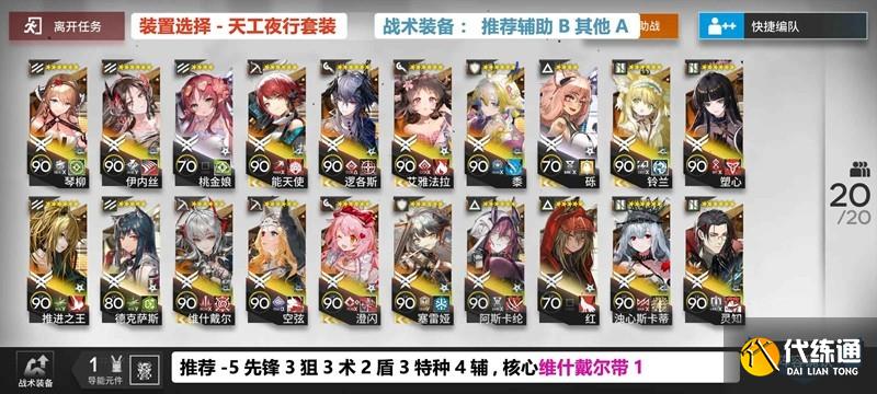 核心:采用維什戴爾單核帶1(盡量專3),裝置推薦選[天工夜行套裝],陣容為5先鋒3狙擊3術士2奶盾3特種(帶一個地刺如阿斯卡綸&伊桑)4輔助,選干員可以多拿特種和術士做做保全任務。