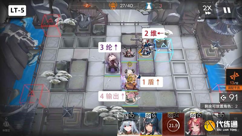 第六關:開頭多拿點地面,放在奶盾地刺位置,然后找維(推薦3術2狙擊),地刺和奶盾也要同時疊,求穩可以下面高臺加輸出,注意用特種刷新奶盾,最后部署奶盾來吸引仇恨。