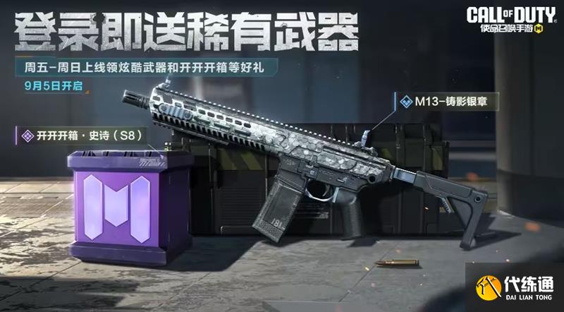 9月5日(本周五),周末登錄禮上線。戰士們在周末期間登錄游戲,即可領取稀有級武器M13-鑄影銀章、開開開箱和任務卡等好禮,任務卡可用于快速完成福利手冊的周任務,助你輕松完成周任務!