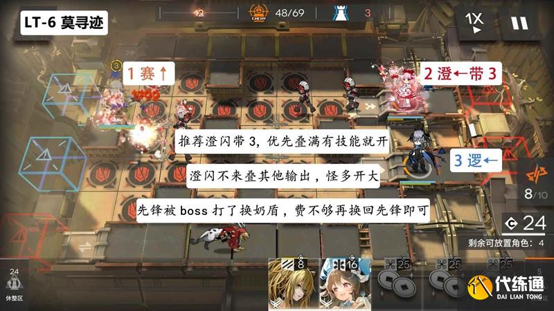 第六關(guān):開局直接右側(cè)放高臺輸出,推薦帶澄閃3技能且優(yōu)先疊滿裝備,然后澄閃有技能就開即可穩(wěn)定通關(guān)。右邊兩輸出疊到高層裝備也能掛機(jī),boss直接放生即可,只會扣一血。等boss從藍(lán)門離開放先鋒回費(fèi),boss回來就換成奶盾,費(fèi)用不夠再替換成先鋒,陣容成型再換成奶盾防止漏人。