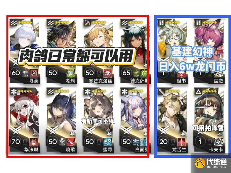 大致用途如圖,日常和基建,比較推薦新手練日常類,,推圖較無壓力的練基建類,能較快回本