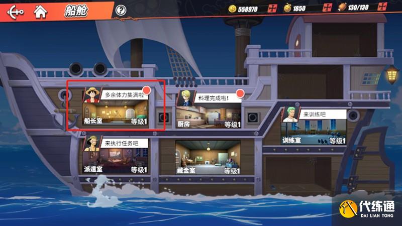船長室系統為航海王熱血航線增添了離線體力儲存機制。當角色不在線時溢出的體力,其中60%會被保存進船長室,最高可存儲60點(隨等級提升而增加)。只需進入船長室點擊桌上的雞腿圖標即可領取。升級船長室需要滿足等級條件,并消耗金幣與時間,但長期來看對體力管理十分有利。 航海王熱血航線的體力獲取方式多樣,結合自然恢復、定時領取、金果購買、道具使用與船長室儲存,能夠有效緩解資源緊張問題。