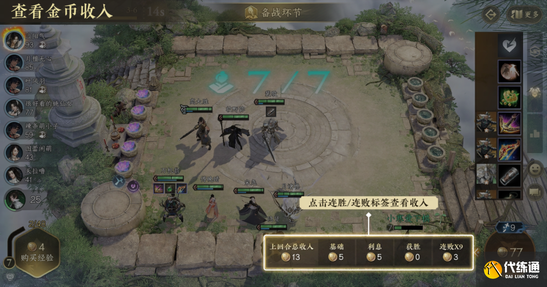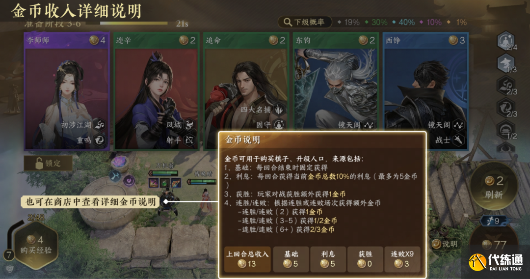 金幣的來源包括利息、連勝連敗,每存10金幣就能在下回合獲得1利息,最多5利息,因此咱們通常可以積累到50金幣讓收益最大化哦!