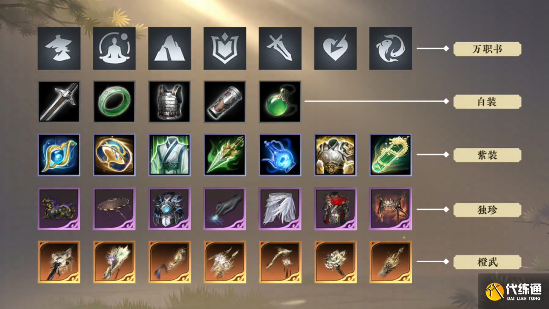 ③裝備的品質:分為白裝、紫裝、獨珍、橙武,品質依次升高,對應屬性也越強。此外還有萬職書,裝備萬職書的棋子可以獲得對應的羈絆。