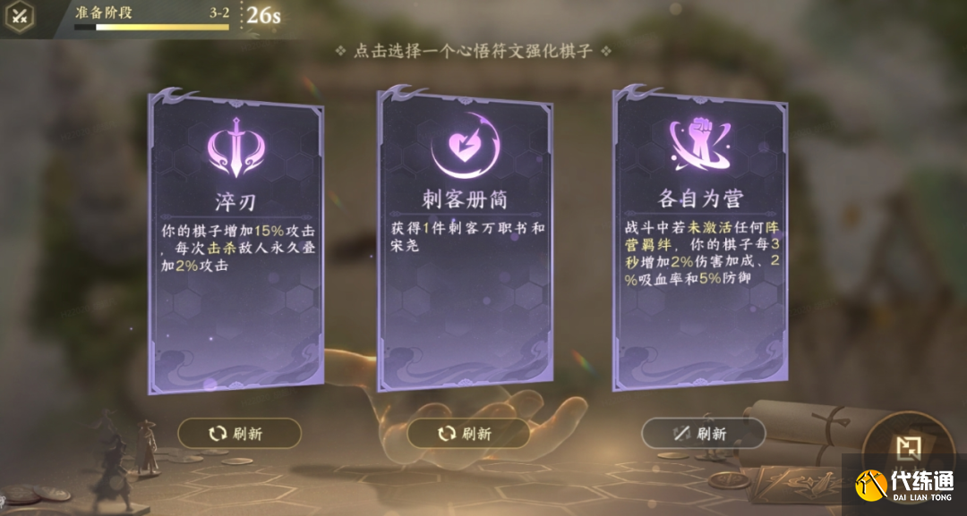 在2-1、3-2、4-2階段玩家需要選擇心悟,分為經濟類(幫助獲得更多金幣)和戰力類(直接提升棋子戰力),需要權衡進行選擇~(如果不滿意,每個心悟可以點一次刷新進行更換)