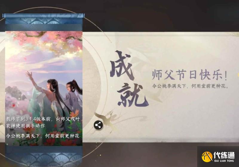 和師父葉哀禪(三清山,1146,802),或者自己結拜的師父使用“拱手”動作可達成成就“師父節(jié)日快樂!”并獲得綁玉獎勵。