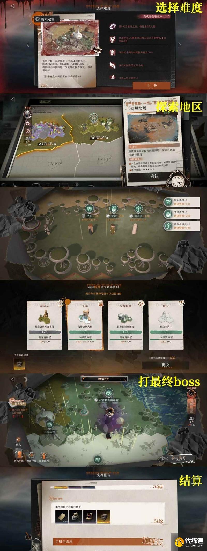 選擇難度→探索不同地區(qū)→招募人員,賺錢(qián),獲取轉(zhuǎn)譯進(jìn)度→投票獲取不同buff→打最終boss→結(jié)算