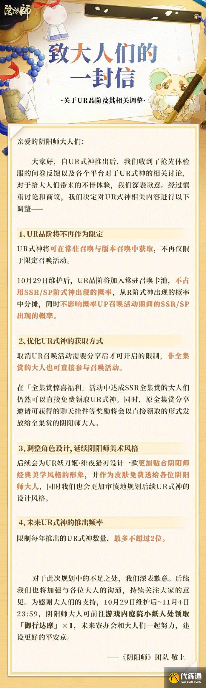 陰陽師即將在10月29日上線第一位UR階式神,今天官方對于UR式神的相關內容進行了調整,那么究竟調整了哪些內容呢?下面快跟隨多特小編一起來看看陰陽師UR式神內容調整吧。