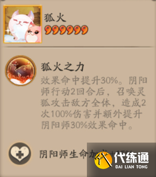 效果命中提升30%。陰陽師行動2回合后,召喚靈狐攻擊敵方全體,造成2次100%傷害并額外提升陰陽師30%效果命中。