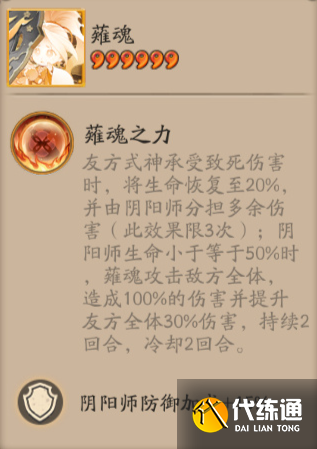 友方式神承受致死傷害時,將生命恢復(fù)至20%,并由陰陽師分擔多余傷害(此效果限3次);陰陽師生命小于等于50%時,薙魂攻擊敵方全體,造成100%的傷害并提升友方全體30%傷害,持續(xù)2回合,冷卻2回合。