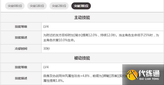 她的被動(dòng)技能則專注于風(fēng)屬性攻擊的增益強(qiáng)化。初始等級(jí)即可提升自身與協(xié)戰(zhàn)同伴2.4%的風(fēng)屬性攻擊力,若隊(duì)伍中含有前綴為“契約者”或“獅鷲”的魔之楔單位,額外再增加0.9%的風(fēng)屬性攻擊加成。隨著技能升級(jí),最終風(fēng)屬性攻擊加成可達(dá)4.8%,多個(gè)風(fēng)屬性成員可疊加此效果,形成顯著的團(tuán)隊(duì)增益體系。