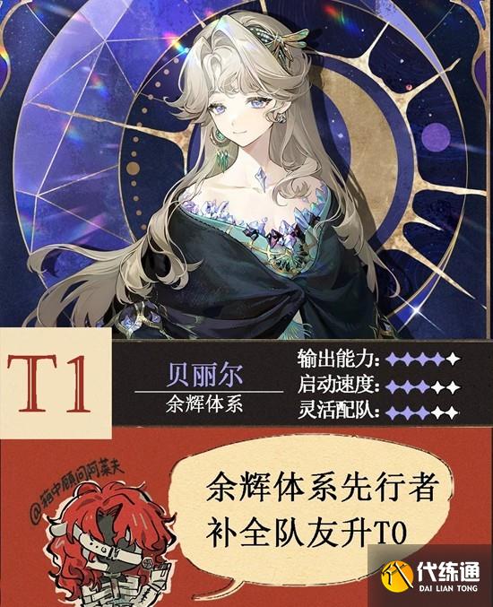 開篇省流:給限定角色排T1確實壓力很大,但貝麗爾余輝隊的表現比不上薪血、電能也是現實情況,我這里沒有T0.5這種檔位,于是就給T1了。畢竟【余輝隊】作為一個只有兩名成員的新晉體系,比不上四人滿員的老體系也很正常。貝麗爾作為余輝體系的核心輸出位,其地位會隨著體系的補全而逐步抬升,廚貝麗爾的司辰倒也不必悲觀。