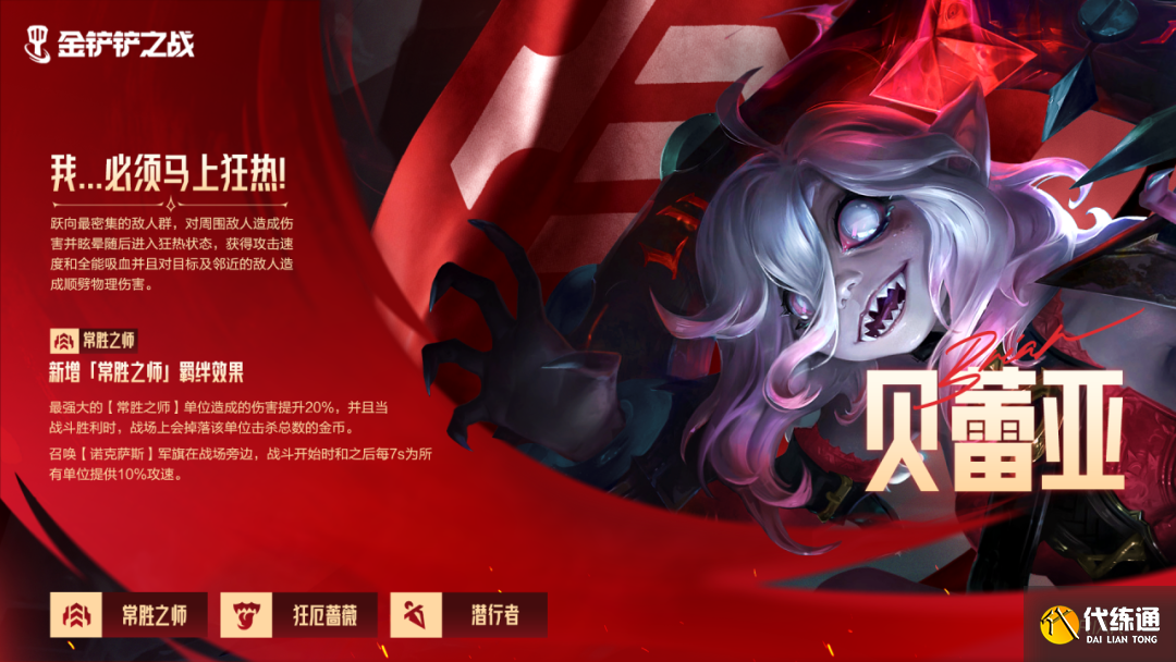 召喚【諾克薩斯】軍旗在戰場旁邊,戰斗開始時和之后每7s為所有單位提供10%攻速。