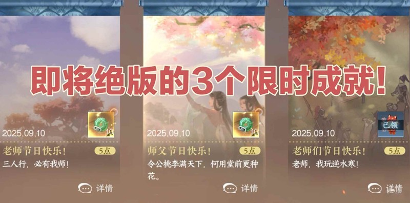 逆水寒游戲玩家扮演一名自在門的弟子,為了調查屠村疑案的真相、尋求破解毒蠱的方法不斷在江湖中進行冒險。那么游戲中限時成就應該怎么獲得呢?小編為你準備了一份攻略,一起來看看吧~ 3.1.4版本3個限時成就,錯過即絕版! 在世界頻道發送“老師們節日快樂!”可達成成就“老師們節日快樂!”并獲得表情包:勞 閱讀全文...