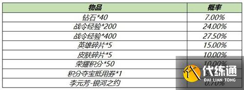 打開(kāi)可隨機(jī)獲得以下獎(jiǎng)勵(lì)之一:李元芳-銀河之約、積分奪寶抵用券*1、英雄碎片*5、皮膚碎片*5、榮耀積分*50、200/400戰(zhàn)令經(jīng)驗(yàn)、鉆石*40。