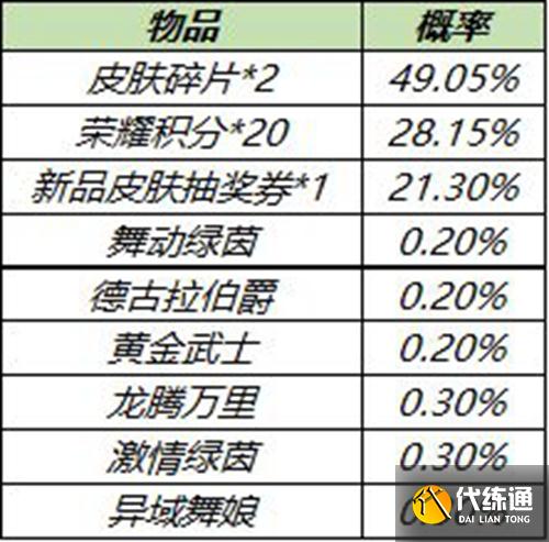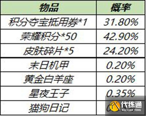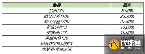 打開(kāi)可隨機(jī)獲得以下獎(jiǎng)勵(lì)之一:沈夢(mèng)溪-星空之諾、積分奪寶抵用券*1、英雄碎片*3、皮膚碎片*3、榮耀積分*30、100/200戰(zhàn)令經(jīng)驗(yàn)、鉆石*30。