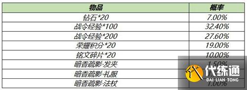 打開(kāi)可隨機(jī)獲得以下獎(jiǎng)勵(lì)之一:暗香疏影·發(fā)夾、暗香疏影·禮服、暗香疏影·法杖、榮耀積分*20、100/200戰(zhàn)令經(jīng)驗(yàn)、鉆石*20、銘文碎片*20。【價(jià)格】:10戰(zhàn)令幣