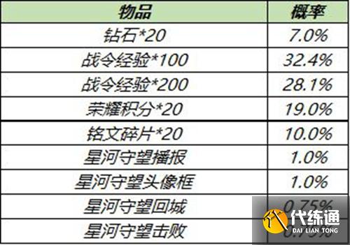 打開(kāi)可隨機(jī)獲得以下獎(jiǎng)勵(lì)之一:星河守望頭像框、星河守望榮耀播報(bào)(永久)、星河守望回城(永久)、星河守望擊敗(永久)、榮耀積分*20、100/200戰(zhàn)令經(jīng)驗(yàn)、鉆石*20、銘文碎片*20。【價(jià)格】:10戰(zhàn)令幣