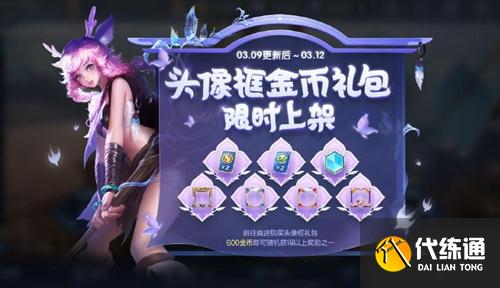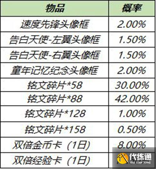 打開(kāi)后可隨機(jī)獲得以下獎(jiǎng)勵(lì)之一:速度先鋒頭像框、告白天使-左翼頭像框、告白天使-右翼頭像框、童年記憶紀(jì)念頭像框、雙倍金幣卡:1日、雙倍經(jīng)驗(yàn)卡:1日、銘文碎片*158/128/88/58。上架時(shí)間:3月9日更新后~3月12日23:59