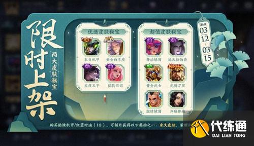 購(gòu)買(mǎi)紅藍(lán)對(duì)決(1日),可額外隨機(jī)獲得以下之一:舞動(dòng)綠茵、德古拉伯爵、黃金武士、龍騰萬(wàn)里、激情綠茵、異域舞娘、榮耀積分*20、新品皮膚抽獎(jiǎng)券*1、皮膚碎片*2。上架時(shí)間:3月12日0:00~3月15日23:59