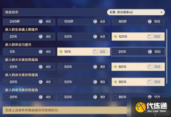 時間不選,生命拉滿,攻擊選10%,火抗拉滿,冰抗拉滿,草抗不選,最后三個敵方增幅選前兩個。