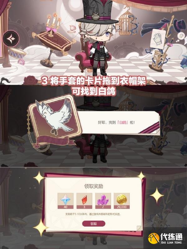 再把手套放在帽子里,找到白鴿最后獲得花束即可領取對應的原石獎勵。