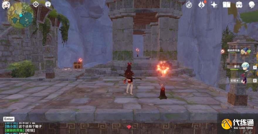 2、第一個寶箱需要巖元素,下圖所示的燈每個都要踩一下,如果踩到了爆炸的燈可以解鎖機關了,然后使用巖元素去開啟寶箱。