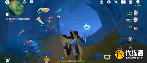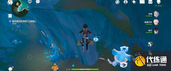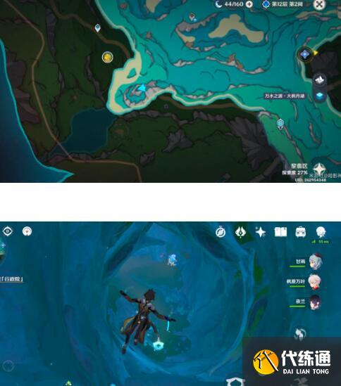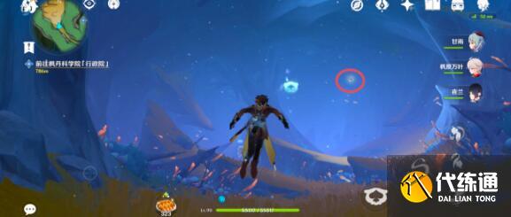 我們接著往里走,走到如圖位置之后會出現(xiàn)提示(這里我已經(jīng)完成了這個成就,所以沒顯示),提示的大概意思就是:這里是危險水域,在其中活動會掉血(就和稻妻的雷禍一樣)。在此區(qū)域中,有許多如圖中所示的可以回血的魚,為的是防止你因扣血而死。