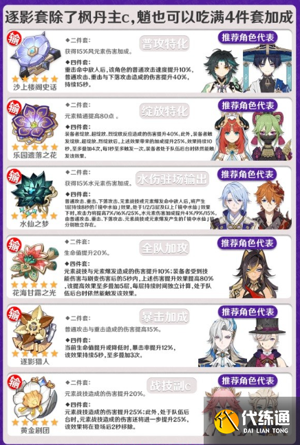 一些角色雖然不能吃到二件套效果,但四件套的效果還是能吃滿的,比如給魈用新版本的逐影套,雖然下落攻擊沒有加成,但大招持續掉血機制可以讓其穩定保持36%暴擊率加成。