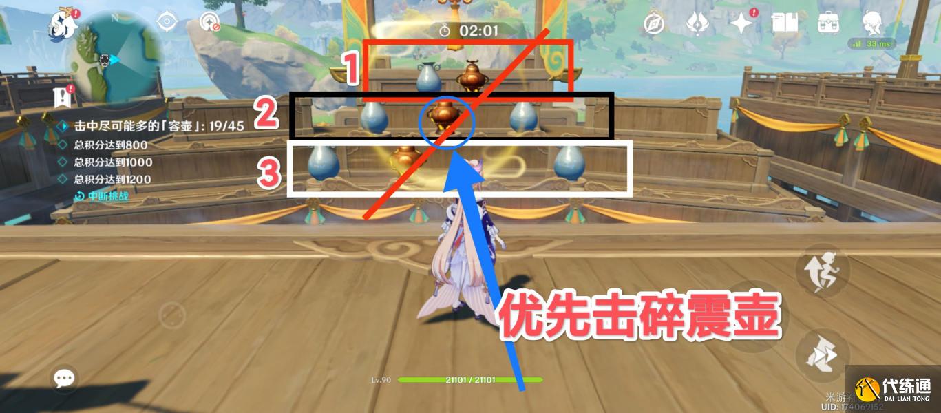 第4組可以分為三個區(qū)域(1、2、3)長按投擲鍵瞄準中間2區(qū)域的震壺擊碎它(注意等到三個震壺連成一條線后)