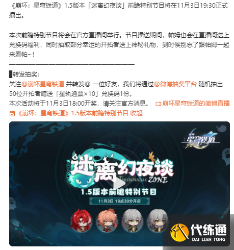 《崩壞:星穹鐵道》1.5版本「迷離幻夜談」前瞻特別節目將在11月3日19:30正式播出。