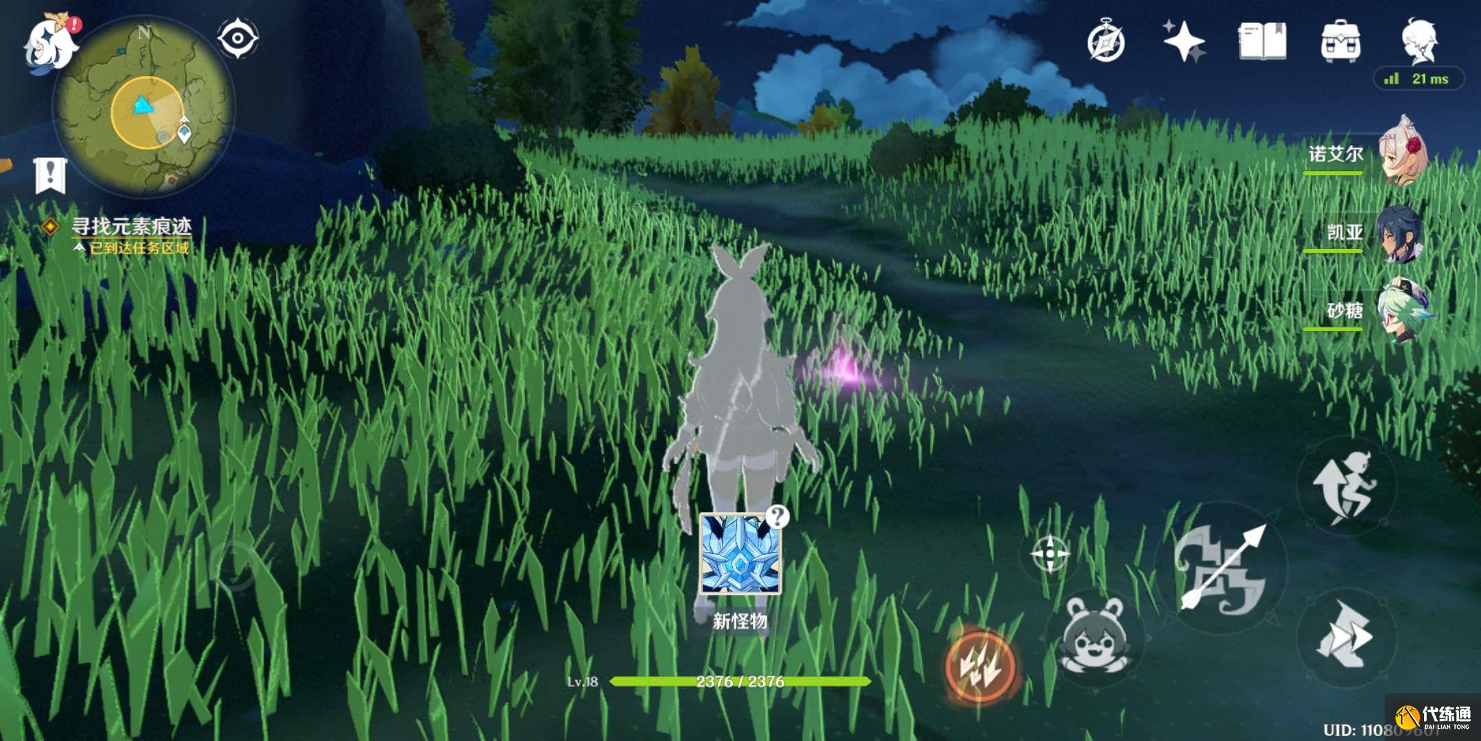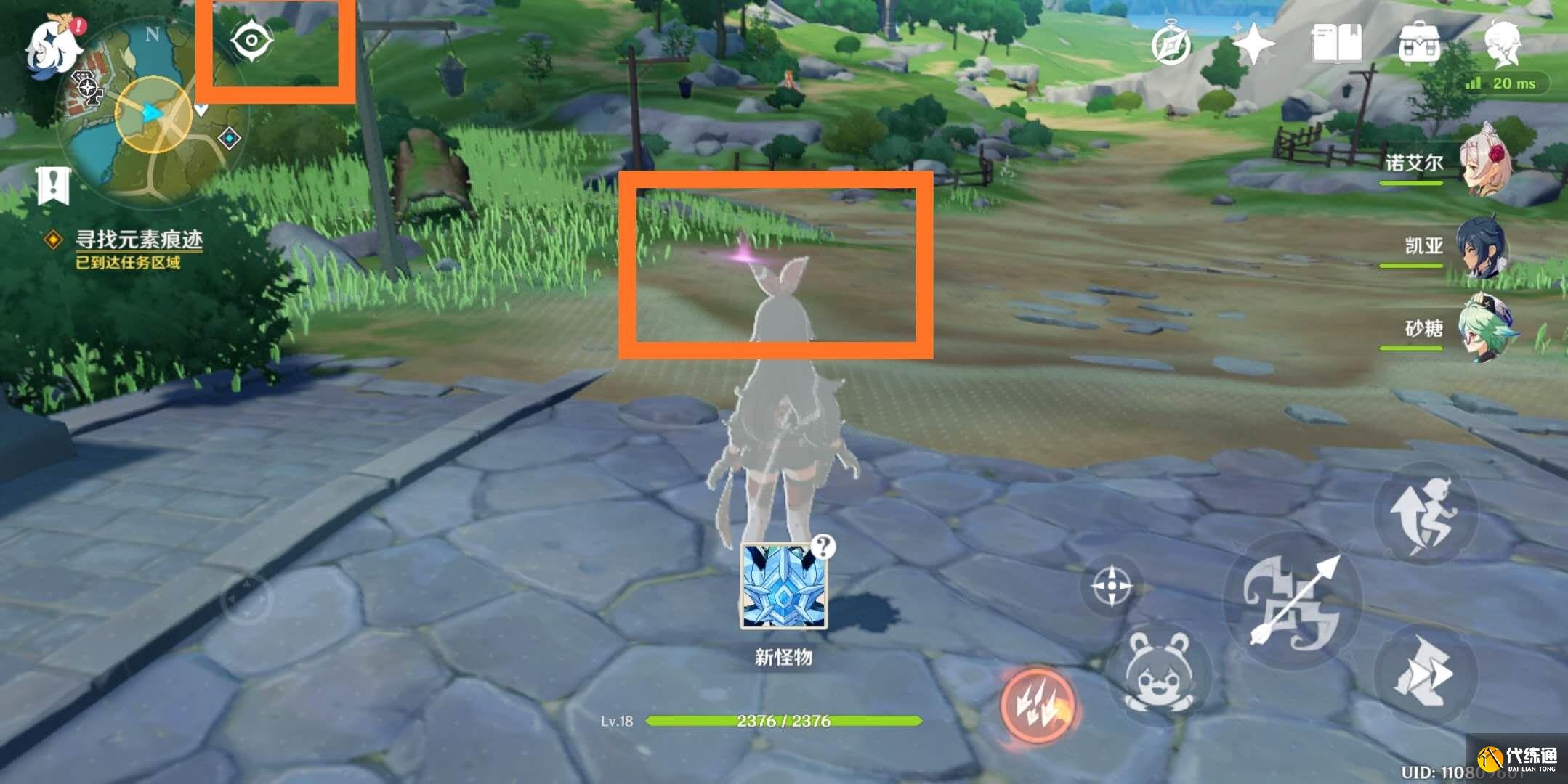1、就是根據任務提示,到達指定區域,打開元素視野(手機玩家點左上角的眼睛,電腦玩家點擊鼠標中鍵),查看紫色的光點;