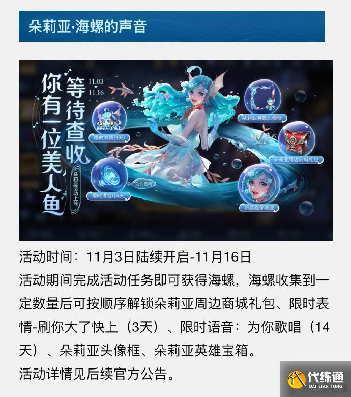 活動期間完成活動任務即可獲得海螺,海螺收集到一定數量后可按順序解鎖朵莉亞周邊商城禮包、限時表情-刷你大了快上(3天)、限時語音:為你歌唱(14天)、朵莉亞頭像框、朵莉亞英雄寶箱。