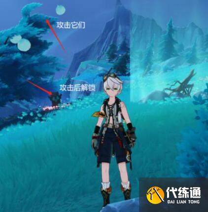 這邊要先攻擊樹上的史萊姆氣球然后可以看到風元素方碑。