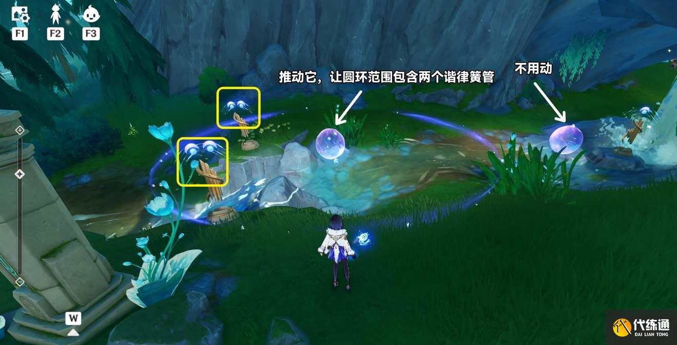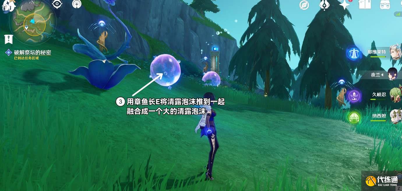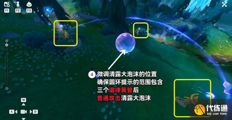 1、第一處:用章魚長(zhǎng)E將清露泡沫推到一起,融合成一個(gè)大的泡沫。調(diào)整泡沫的位置,確保圓環(huán)提示的范圍包含三個(gè)諧律簧管,然后使用普攻攻擊泡沫即可完成解密。
