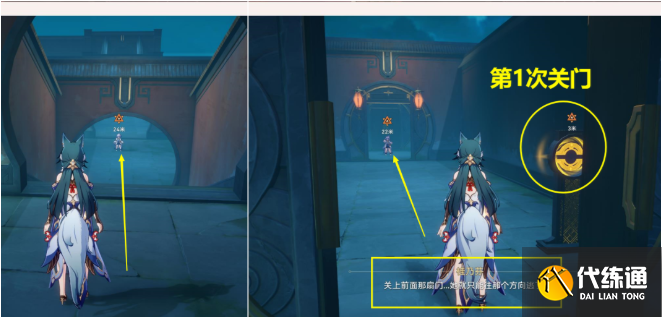4、進副本后,下去一直先追著逃跑的【白露】走,一直追到下圖位置時,【桂乃芬】會提示我們【關(guān)門】,這時我們將下圖位置的門關(guān)了,這里是關(guān)第1個門,后面還需要關(guān)2個門,【關(guān)門】的目的是堵住逃跑的【白露】,最終將其趕到陣法里,捉住附在【白露】身上的歲陽【阿灼】,后面找不到具體位置的,可以看左上小地圖我的位置
