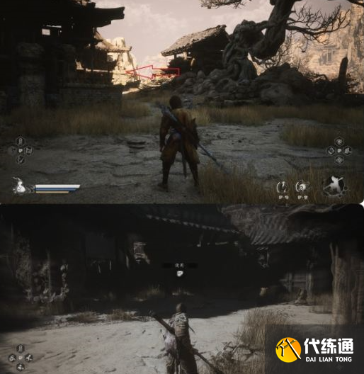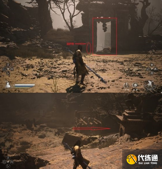 3、之后傳送到沙門村-不濟谷土地廟處,從這個土地廟出發,在沙國王父子boss戰場地用護符打開旁邊的捷徑大門(也可以從挾魂崖石先鋒后面的路繞過去),進門后下樓梯,在橋前面往右轉,到達場地中央后搖響第二次撥浪鼓。