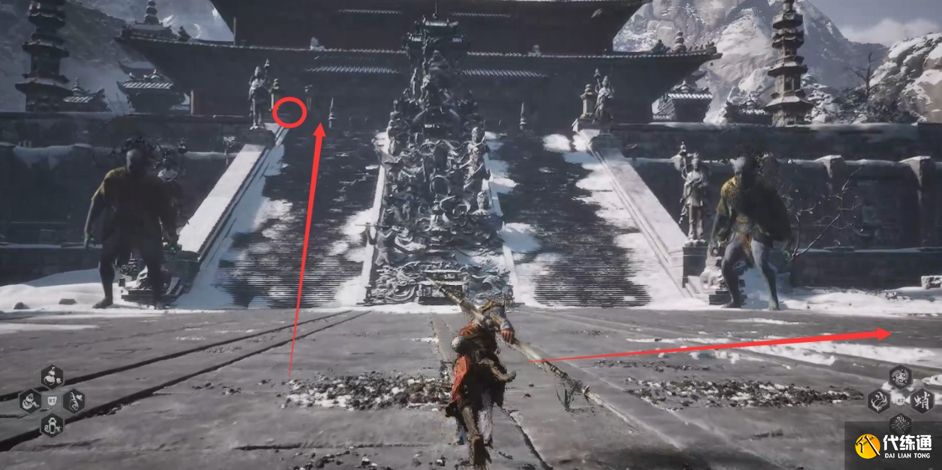 4、然后往北走上階梯,到大門左邊激活大殿土地廟。我們先去把支線任務交了,再回來進入大殿打黃眉怪。